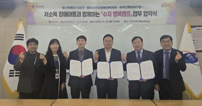 [뉴스앤톡] 용인특례시 수지구는 13일 용인시수지장애인복지관과 수지신용협동조합과 함께 저소득 장애아동의 복지 향상과 장애 인식 개선을 위한 ‘수지 행복캠프’ 추진 업무협약을 체결했다고 14일 밝혔다.