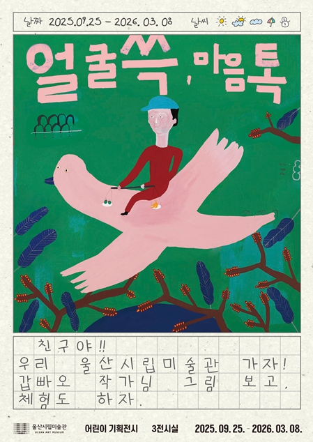 [뉴스앤톡] 울산시립미술관은 오는 9월 25일부터 내년 3월 8일까지 1층 3전시실과 로비에서 어린이전시 ‘얼굴 쓱, 마음 톡’을 연다고 밝혔다.