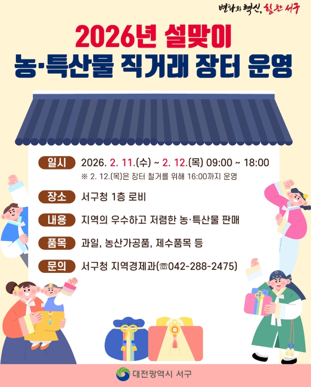 대전 서구는 이달 11일부터 12일까지 이틀간 구청 1층에서 설맞이 농특산물 직거래 판매장을 운영한다.