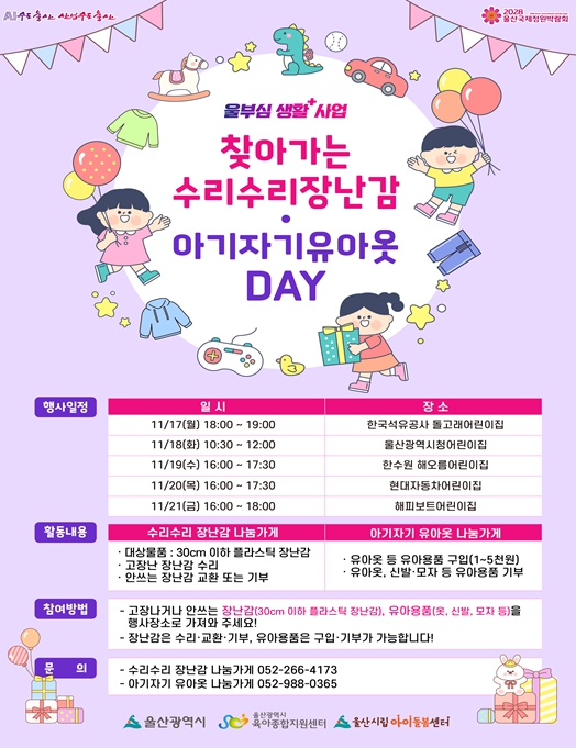 울산시 관계자는 “이번 행사는 장난감과 유아옷을 통해 세대를 잇고 아이의 감정을 보듬는 뜻깊은 자리”라며 “시민이 함께 만드는 울부심 생활플러스 사업을 지속적으로 확대해 나가겠다”라고 말했다.