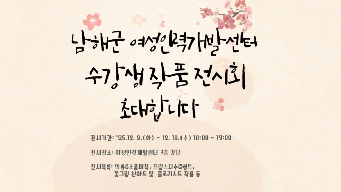 [뉴스앤톡] 남해군 여성인력개발센터는 오는 12월 9일∼10일 양일간 한 해를 마무리하는 작품 전시회를 개최한다.