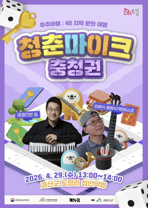 [뉴스앤톡] 충북 괴산군은 지역 공간과 함께하는 거리공연 ‘청춘마이크’가 오는 29일과 5월 3일 두 차례에 걸쳐 개최된다고 밝혔다.