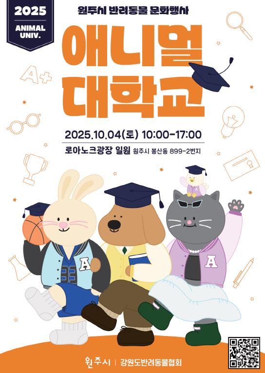[뉴스앤톡] 원주시농업기술센터는 10월 4일 오전 10시 원주천 로아노크광장에서 반려동물 문화행사 ‘애니멀 대학교’를 개최한다.