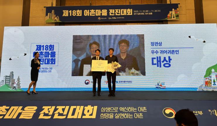 [뉴스앤톡] 전라남도해양수산과학원은 오늘 경주에서 열린 제18회 어촌마을 전진대회에서 2020년 전남귀어학교 제2기 수료생인 완도 김진호(46) 씨가 우수 귀어귀촌인 대상에 선정돼 해양수산부 장관 표창을 받았다고 밝혔다.