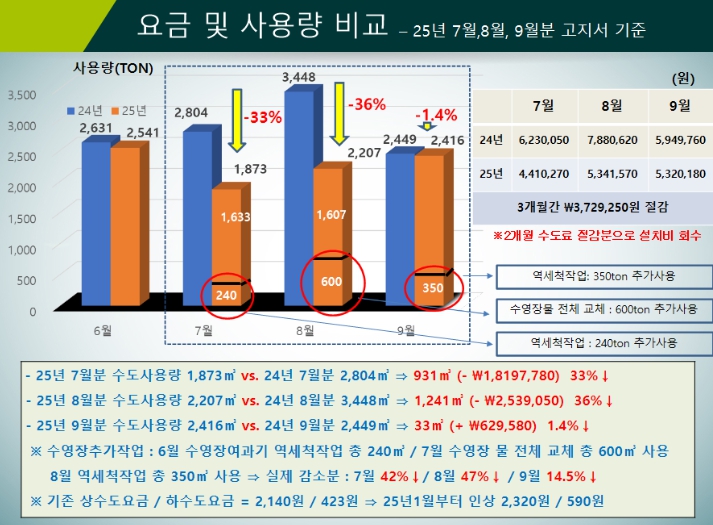 성과 분석 결과, 7월 수도 사용량은 전년 동월 대비 33%(931㎥) 절감, 8월은 36%(1,241㎥) 절감됐다.