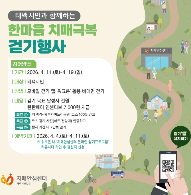 [뉴스앤톡] 태백시는 치매에 대한 인식 개선과 치매친화적 환경 조성을 위해 ‘2026년 한마음 치매극복 걷기행사’를 비대면 방식으로 운영한다고 밝혔다.
