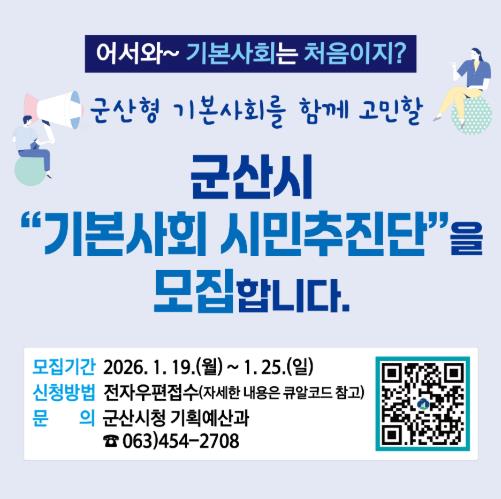 이길용 기획행정국장은 “기본사회 시민추진단은 시민이 정책의 대상이 아닌 주인으로서 자신의 권리를 직접 설계하는 핵심 거버넌스.”라며, “더 나은 군산의 미래를 만들어가는 과정에 시민들의 적극적인 관심과 참여를 기대한다.”라고 말했다.