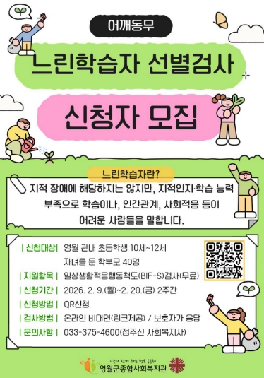 [뉴스앤톡] 영월군종합사회복지관은 학습과 일상생활에서 어려움을 겪는 아동을 조기에 발견하고 적절한 지원 방향을 모색하기 위해 느린학습자 선별검사 신청자를 모집한다고 밝혔다.