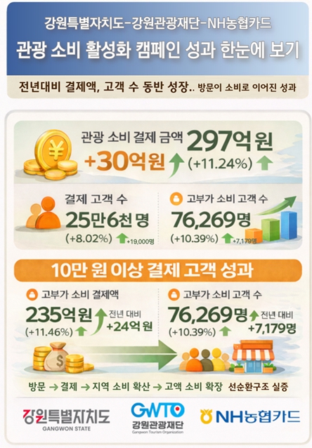 [뉴스앤톡] 강원특별자치도와 강원관광재단은 NH농협카드와 함께 추진한 ‘강원 관광소비 활성화 상생 캠페인’ 결과, 전년 동일 기간 대비 관광 소비 금액과 결제 고객 수가 모두 증가하며 실질적인 지역 소비 활성화 성과를 거둔 것으로 나타났다.