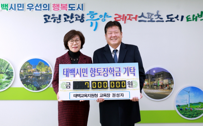 [뉴스앤톡] (재)태백시민향토장학회는 강원특별자치도태백교육지원청 권성자 교육장이 오랜 공직생활을 마무리하며 장학금 700만 원을 기탁했다고 밝혔다.