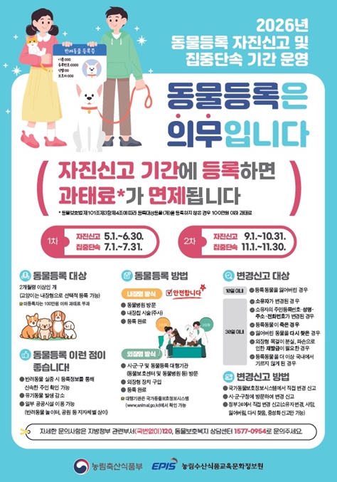 장세환 인천시 농축산과장은 “반려견 등록은 책임 있는 반려문화 정착을 위한 기본 의무”라며 “미등록 또는 변경신고를 하지 못한 경우 자진신고 기간을 적극 활용해 주시길 바란다”라고 말했다.