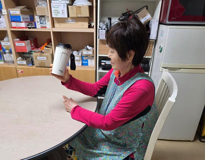 | ▲ 성동구는 공동주택 필수노동자 대상 근무환경 개선 물품으로 텀블러를 배부하고 있다 |