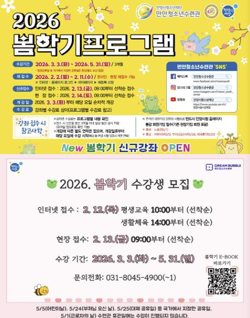 만안청소년수련관은 3월 3일부터 5월 31일까지 봄학기 강좌를 운영하며, 총 141개 강좌, 245개 반을 개설한다. 수강 신청은 2월 13일부터 온라인 접수, 2월 14일부터 현장 방문 접수가 가능하며, 모든 강좌는 선착순으로 모집한다.