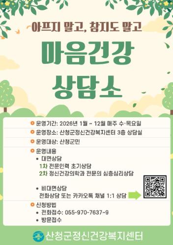 또 전화 또는 산청군정신건강복지센터 카카오톡 채널 등 지역적·심리적 어려움이 있는 군민을 위한 비대면 상담도 마련됐다.