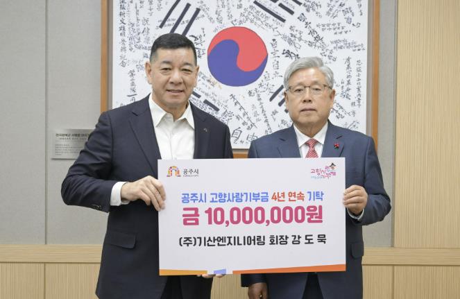 [뉴스앤톡] 공주시는 지난 9일 ㈜기산엔지니어링 강도묵 회장이 4년 연속 고향사랑기부제 고액 기부를 이어가며 남다른 고향사랑의 마음을 전하고 있다고 밝혔다.