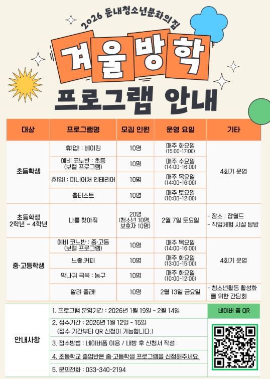 [뉴스앤톡] 둔내청소년문화의집이 다가오는 겨울방학을 맞아 지역 청소년들의 소질 계발과 유익한 여가 선용을 위한 ‘2026년 겨울방학 프로그램’ 수강생을 모집한다.