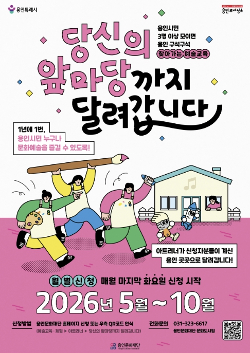 [뉴스앤톡] 용인문화재단은 시민이 원하는 시간과 장소로 직접 찾아가는 2026 찾아가는 예술교육 '당신의 앞마당까지 달려갑니다'의 참여자를 오는 4월 7일부터 모집한다.