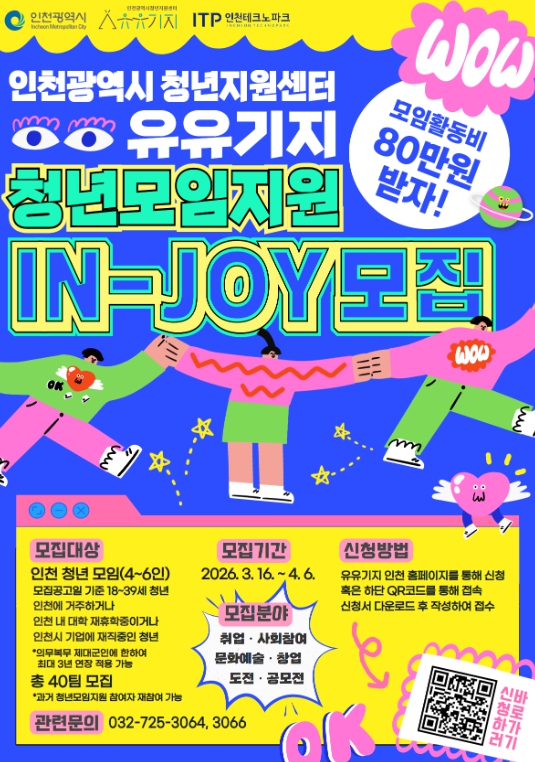 ‘청년모임지원(IN-JOY)’ 프로그램은 인천 청년들이 △취업 △창업 △문화예술 △사회참여 △공모전 등을 목적으로 구성한 모임의 활동비를 최대 80만 원까지 지원하는 사업이다.