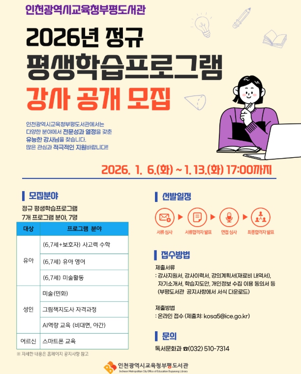 [뉴스앤톡] 인천광역시교육청부평도서관은 시민의 평생학습 기회를 확대하고 행복한 삶을 지원하기 위해'2026년도 정규 평생학습 프로그램' 강사를 모집한다.