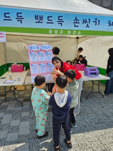 | ▲ 어린이날 행사장에서 어린이들이 ‘뽀드득 뽀드득 손씻기 체험’을 통해 감염병 예방을 위한 건강한 생활습관을 익히고 있다. |