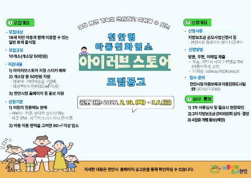 [뉴스앤톡] 아동친화도시 천안시가 아이 동반 가족이 안심하고 이용할 수 있는 아동친화업소 ‘아이러브스토어’ 10곳을 모집한다고 19일 밝혔다.