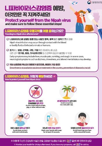 니파바이러스 감염증은 감염된 과일박쥐나 돼지 등 동물과 접촉, 오염된 식품(대추야자 수액 등) 섭취로 감염될 수 있으며, 환자의 체액과 밀접 접촉 시 사람 간 전파도 가능한 것으로 알려졌다.