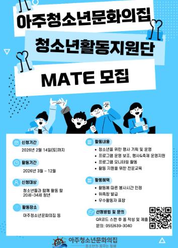 [뉴스앤톡] 거제시 아주청소년문화의집은 오는 2월 14일까지 2026년 청소년 활동을 이끌어갈 청소년활동지원단“MATE”단원을 모집한다고 밝혔다.