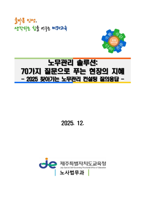 [뉴스앤톡] 제주특별자치도교육청은 5일 ‘노무관리 해결책(솔루션): 70가지 질문으로 푸는 현장의 지혜–2025 찾아가는 노무관리 컨설팅 질의응답’ 자료집을 제작·배포한다.