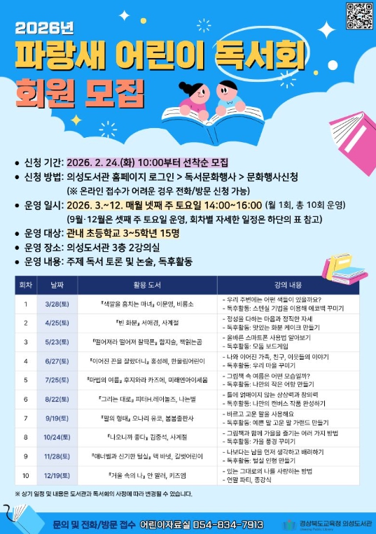 [뉴스앤톡] 경상북도교육청 의성도서관은 오는 24일부터 ‘2026년 파랑새 어린이 독서회’ 신규 회원을 모집한다.