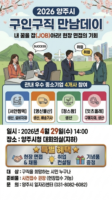행사는 오는 4월 29일 오후 2시부터 4시까지 양주시청 대회의실에서 진행되며, 구직자는 사전 신청 또는 행사 당일 오후 1시 30분부터 현장 접수 후 면접에 참여할 수 있다. 참여를 희망하는 구직자는 이력서 등 지원 서류를 지참해야 한다.