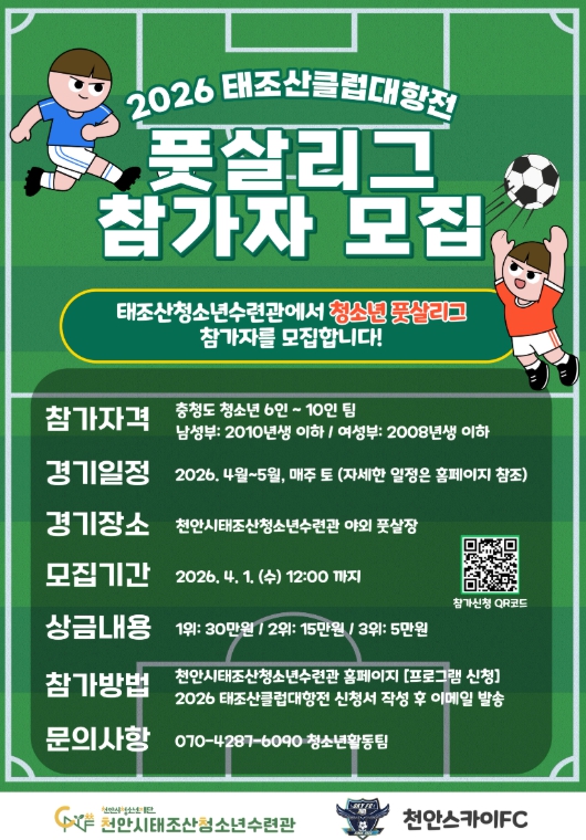 [뉴스앤톡] 천안시청소년재단 산하 천안시태조산청소년수련관은 청소년의 건강한 여가 활동과 스포츠 참여 기회를 확대하기 위해 ‘2026 태조산 클럽대항전 풋살리그’ 참가팀을 모집한다고 20일 밝혔다.