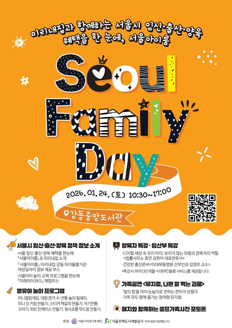 서울패밀리데이는 미리내집 입주민과 강동 지역 주민을 대상으로 서울시 임신·출산·양육 정책을 한자리에서 안내하는 서울아이(i)룸 팝업스토어로, 1월 24일 강동중앙도서관에서 열린다.