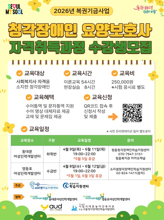 서울시가 추진하는 ‘2026 청각장애인 요양보호사 양성 교육’은 4월 8일부터 6월 12일까지 9주간 청각장애인 40명을 대상으로 진행된다.