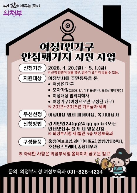 [뉴스앤톡] 의정부시는 4월 20일부터 5월 1일까지 12일간 온․오프라인을 통해 여성 1인 가구 안심패키지 지원사업의 신청을 접수한다.