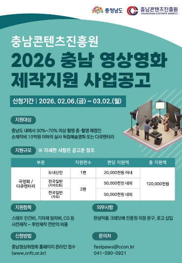 ‘2026 충남 영상·영화 제작지원’ 사업은 충남을 주요 촬영지로 활용한 콘텐츠 제작을 지원해 도내 영상·영화 제작 환경을 강화하고, 지역 영상산업의 경쟁력을 높이기 위해 마련됐다.