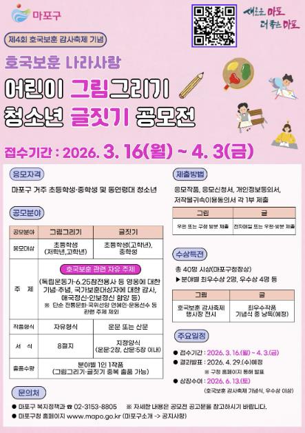 [뉴스앤톡] 마포구는 제4회 호국보훈 감사축제를 맞아 어린이와 청소년이 국가보훈대상자의 희생과 헌신을 기억하고 나라사랑의 의미를 되새길 수 있도록 ‘호국보훈·나라사랑 어린이 그림그리기·청소년 글짓기 공모전’을 개최한다.