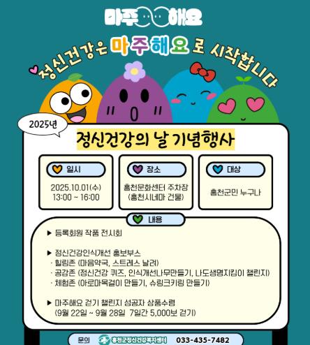 [뉴스앤톡] 홍천군보건소는 세계 정신건강의 날을 기념하여 오는 10월 1일 홍천문화센터에서 정신건강 전시회 및 캠페인을 개최한다고 밝혔다.