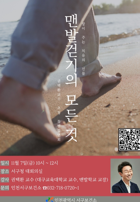 [뉴스앤톡] 인천 서구는 오는 11월 7일에 서구청 대회의실에서 맨발학교 교장 ‘권택환 교수’ 초청 강연회를 진행한다고 밝혔다.