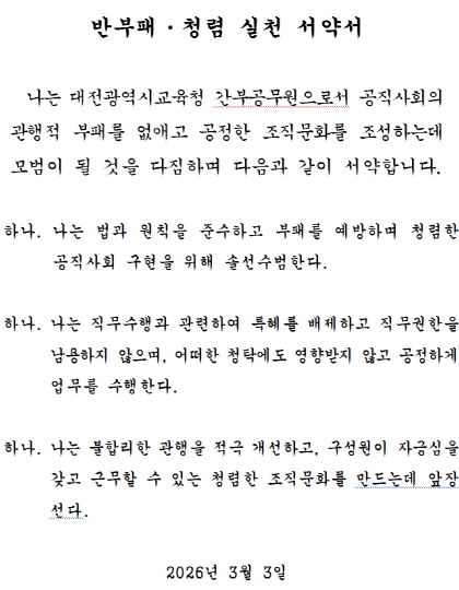 [뉴스앤톡] 대전시교육청은 3월 3일, 시교육청 6층 중회의실에서 고위직 공무원을 대상으로 투명하고 공정한 조직문화 조성을 위한 ‘청렴 실천 서약’을 실시했다고 밝혔다.