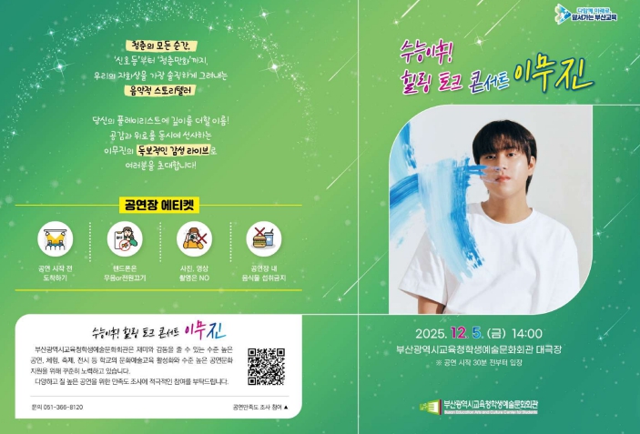 [뉴스앤톡] 부산광역시교육청학생예술문화회관(관장 박은혜)은 오는 5일 오후 2시 학생예술문화회관 대극장에서 수능을 마친 고3 학생 700여 명을 대상으로 가수 이무진과 함께하는 ‘수능 이후! 힐링 토크 콘서트’를 개최한다.