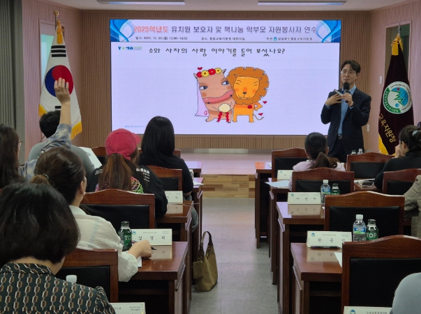[뉴스앤톡] 청송교육지원청은 10월 20일 13시 교육지원청 대회의실에서 관내 유치원 보호자 및 책나눔 학부모 자원봉사자를 대상으로 연수를 실시했다.