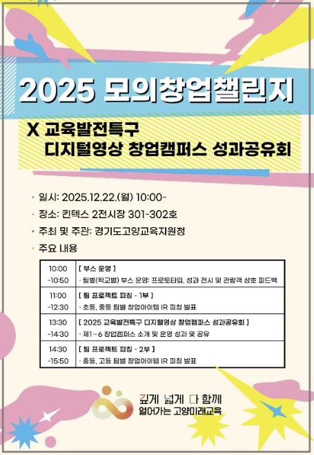 [뉴스앤톡] 고양교육지원청은 오는 12월 22일, 킨텍스 제2전시장에서 '2025 모의창업챌린지×교육발전특구 디지털영상창업캠퍼스 성과공유회'를 개최한다.