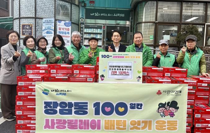 [뉴스앤톡] 의정부시 장암동주민센터는 1월 15일 장암동 새마을지도자협의회·새마을부녀회가 겨울철 어려운 이웃들을 위해 라면 100상자를 전달하며 ‘100일간 사랑릴레이 배턴 잇기’에 동참했다고 밝혔다.