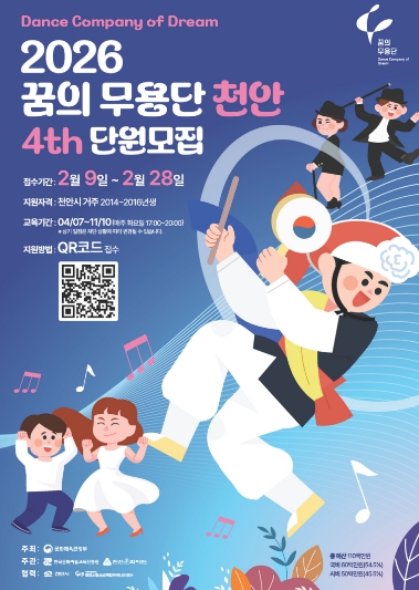 [뉴스앤톡] 천안문화재단이 지역 아동의 예술적 감수성과 협업 역량을 키우는 ‘2026 꿈의 무용단 천안’ 단원을 9일부터 28일까지 모집한다.