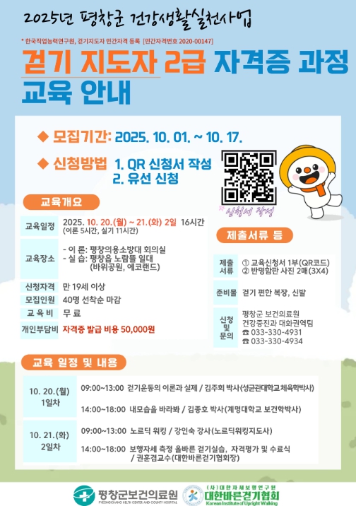 [뉴스앤톡] 평창군보건의료원은 군민의 건강한 걷기 문화를 확산하기 위해 오는 10월 20일부터 21일까지 2일간 ‘걷기 지도자 2급 자격증 과정’ 교육을 운영한다.