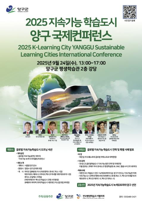 [뉴스앤톡] 양구군은 24일 평생학습관에서 ‘2025 양구 지속가능학습도시 국제컨퍼런스’를 개최한다. 라틴아메리카 GNLC(Global Network of Learning Cities) 시장단 2명을 포함해 관계자 18명 등 총 21명이 초청되며, 양구군민과 평생교육 관계자 등 200여 명이 온·오프라인으로 함께한다.