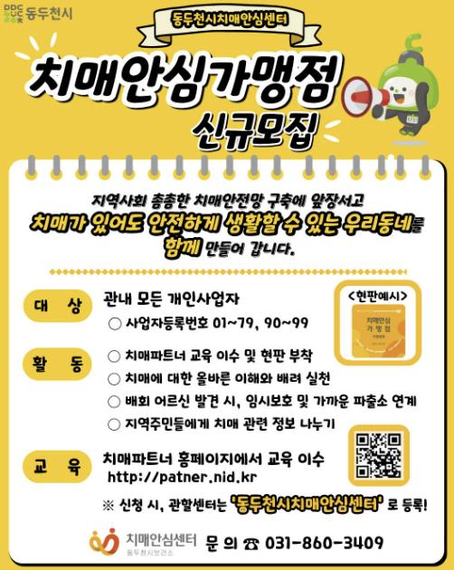 동두천시는 약국과 편의점 등을 포함해 총 24곳을 치매안심가맹점으로 지정하고 있다. 치매안심가맹점은 사업자등록번호 가운데 자리가 01~79 또는 90~99인 모든 개인사업자가 신청할 수 있다. 신청을 희망하는 사업장은 치매파트너 누리집에서 교육을 이수한 후 동두천시 치매안심센터에 신청하면 된다.