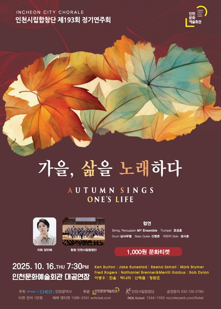 [뉴스앤톡] 인천시립합창단(예술감독 윤의중)은 오는 10월 16일 오후 7시 30분, 인천문화예술회관 대공연장에서 깊어지는 가을의 정취와 함께 삶의 울림과 희망을 담은 무대를 선보인다.