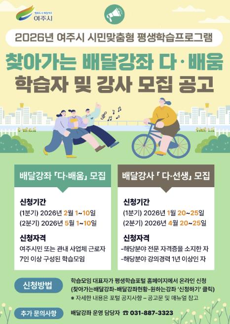 2026년 시민 맞춤형 ‘찾아가는 배달강좌’학습자·강사 신청은 여주시 평생학습포털을 통해 온라인으로 접수하며, 자세한 내용은 여주시 평생학습포털 공지사항을 참고하면 된다.