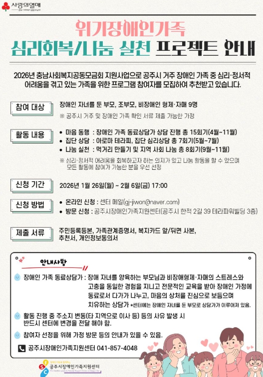 [뉴스앤톡] 공주시 장애인가족지원센터는 2026년 충남사회복지공동모금회 지원을 받아 ‘위기 장애인가족 심리회복 및 나눔 실천 프로젝트’ 참여자를 모집한다고 26일 밝혔다.
